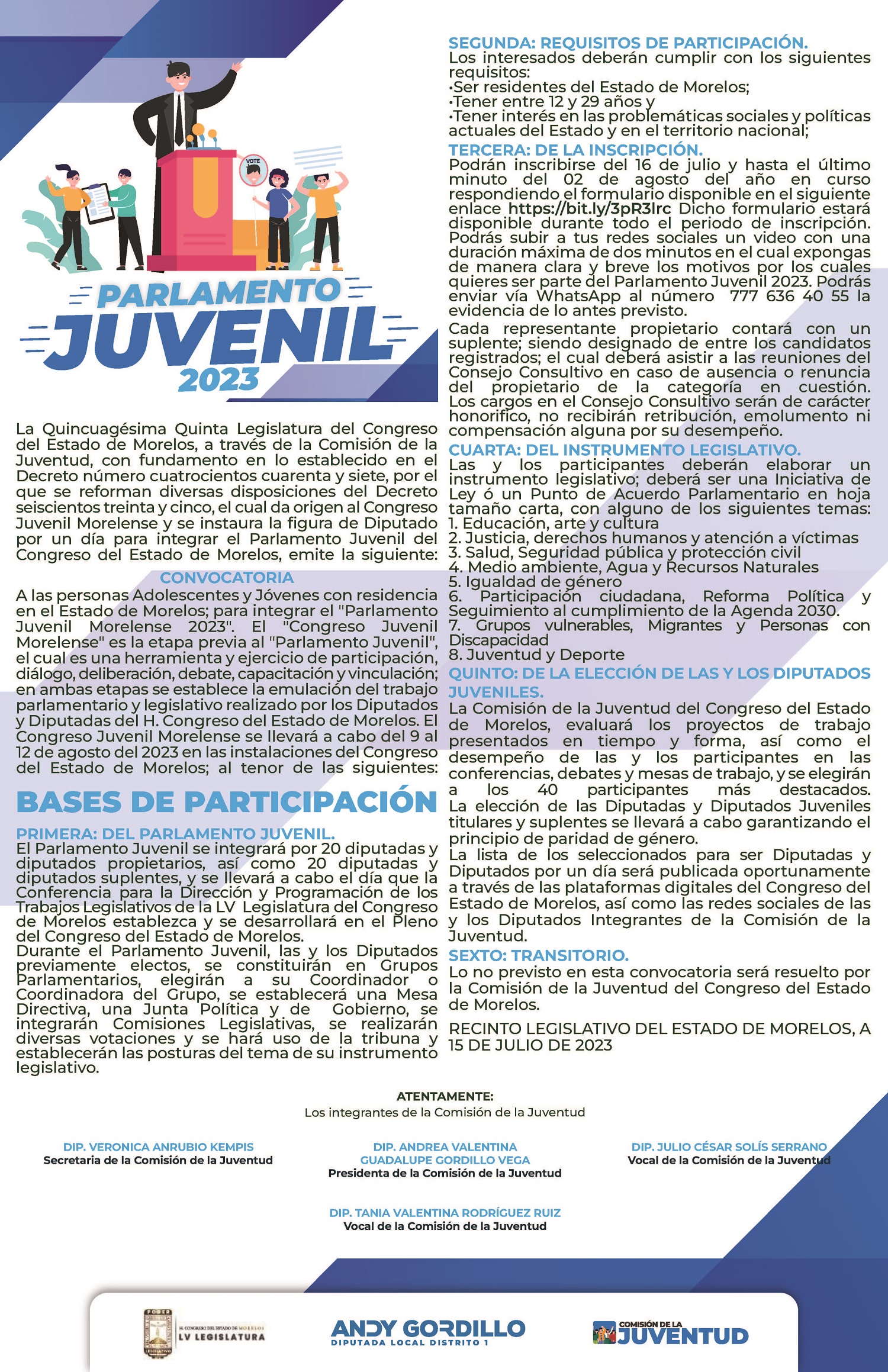 Para impulsar y fomentar la participación de las y los jóvenes, el Congreso del Estado de Morelos, junto a la presidenta de la Comisión de la Juventud, Andrea Gordillo Vega, presentó la Convocatoria del Parlamento Juvenil en su edición 2023, misma que brinda la oportunidad de plantear aquellas inquietudes y problemáticas cotidianas, así como sus respectivas propuestas dirigidas a los tres Poderes de la entidad.