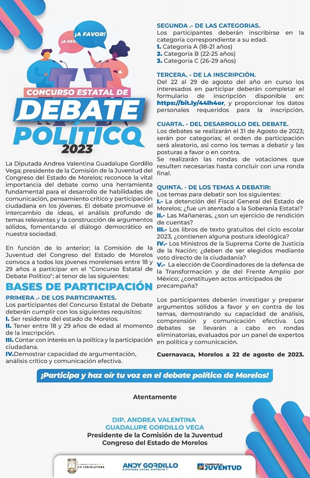 Al dar a conocer de manera formal la convocatoria del Concurso Estatal de Debate Político 2023, #YoCreo, la presidenta de la Comisión de la Juventud, diputada Andrea Gordillo Vega, invitó a la juventud morelense a expresar sus ideas, inconformidades y motivaciones e involucrarse en el quehacer político y social diario.