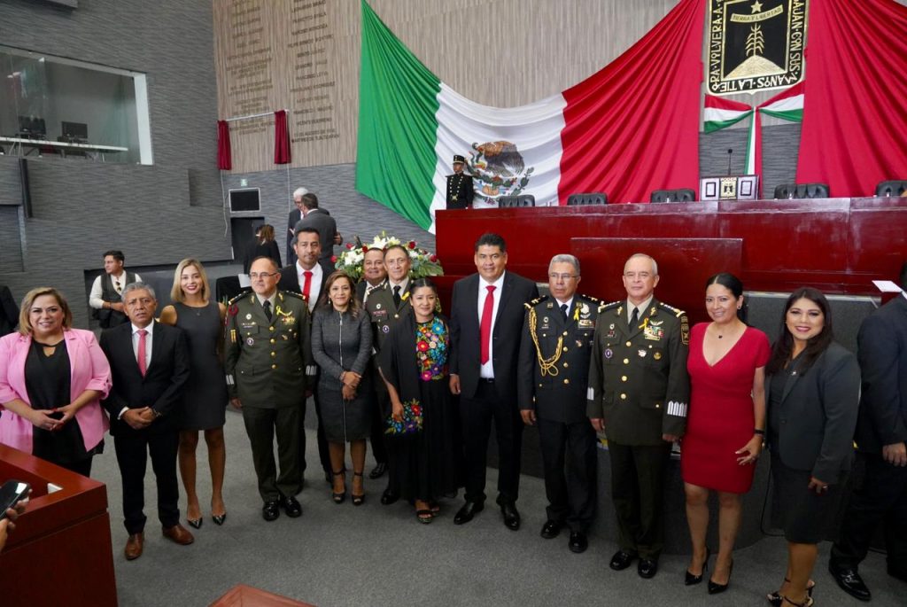 Las diputadas y los diputados de la LV Legislatura develaron este día la inscripción con letras doradas en el muro honor del Congreso del estado de Morelos, de la leyenda “2023, AÑO DEL BICENTENARIO DEL HEROICO COLEGIO MILITAR”, junto con el General de División Diplomado de Estado Mayor (DEM) Celestino Ávila Astudillo, Comandante del Ejército Mexicano y representante del titular de la Secretaría de la Defensa Nacional (SEDENA), General de División Diplomado de Estado Mayor Luis Cresencio Sandoval González.