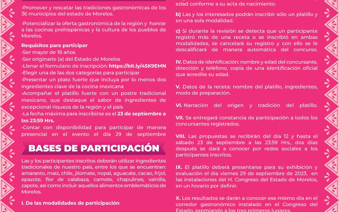 Concurso Gastronómico “¿A qué sabe Morelos?” por soportesistemascem | Sep 13, 2023 | CONVOCATORIAS, DIPUTADA ANDREA VALENTINA GUADALUPE GORDILLO VEGA, GRUPO PARLAMENTARIO DEL PAN Descargar >> Convocatoria Concurso Gastronómico “¿A qué sabe Morelos?”.pdf