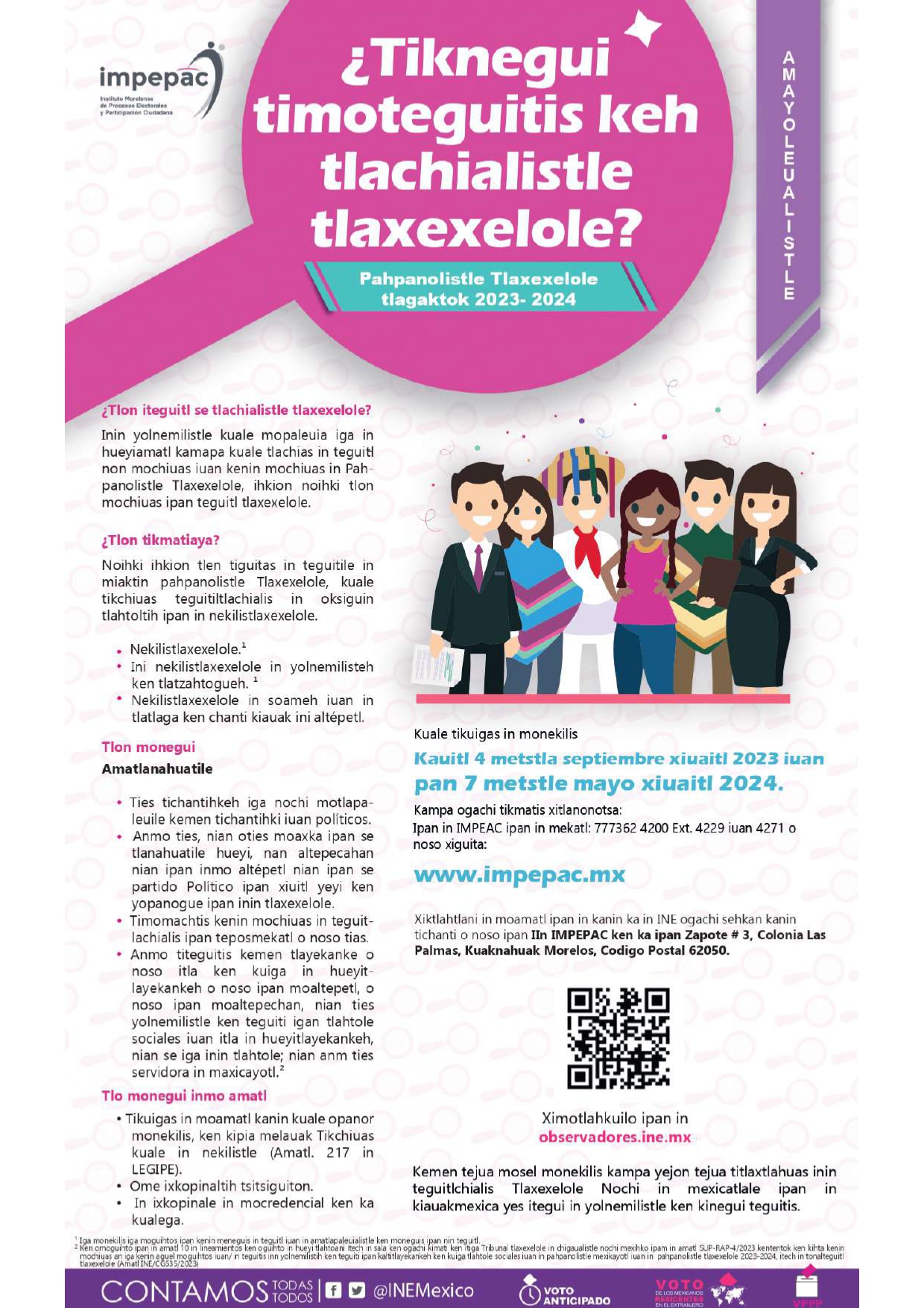 Convocatoria para participar como observadora u observador electoral en el proceso electoral local 2023-2024, versión en náhuatl por soportesistemascem | Dic 1, 2023 | AVISOS IMPEPAC Descargar > > Convocatoria para participar como observadora u observador electoral en el proceso electoral local 2023-2024, versión en náhuatl.pdf