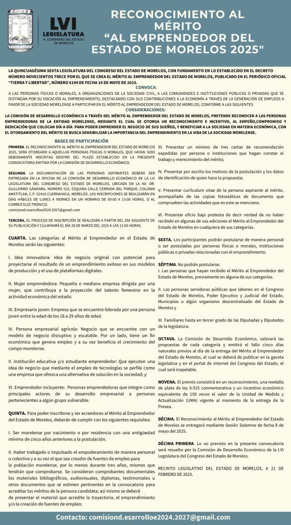 La Comisión de Desarrollo Económico de la LVI Legislatura del Congreso del Estado de Morelos invita a personas físicas y morales, organizaciones de la sociedad civil, comunidades e instituciones públicas o privadas que destacan por su vocación emprendedora, con aportaciones al desarrollo económico del estado a través de la generación de empleos, a participar en la convocatoria del Mérito al Emprendedor del Estado de Morelos.