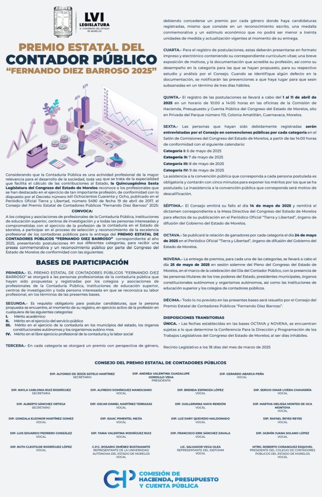 La LVI Legislatura del Congreso del Estado de Morelos convoca a los colegios y asociaciones de profesionales de la contaduría pública, instituciones de educación superior, centros de investigación y personas interesadas en el ejercicio de esta profesión en la entidad, a participar en el Premio Estatal de Contadores Públicos “Fernando Diez Barroso” 2025.