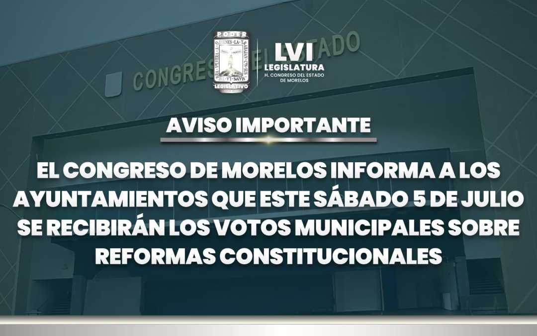 El Congreso del Estado de Morelos informa a los 36 ayuntamientos que, este sábado 5 de julio del presente año, se recibirán exclusivamente los votos municipales relacionados con las reformas a la Constitución Política del Estado Libre y Soberano de Morelos, previamente aprobadas por esta Soberanía.