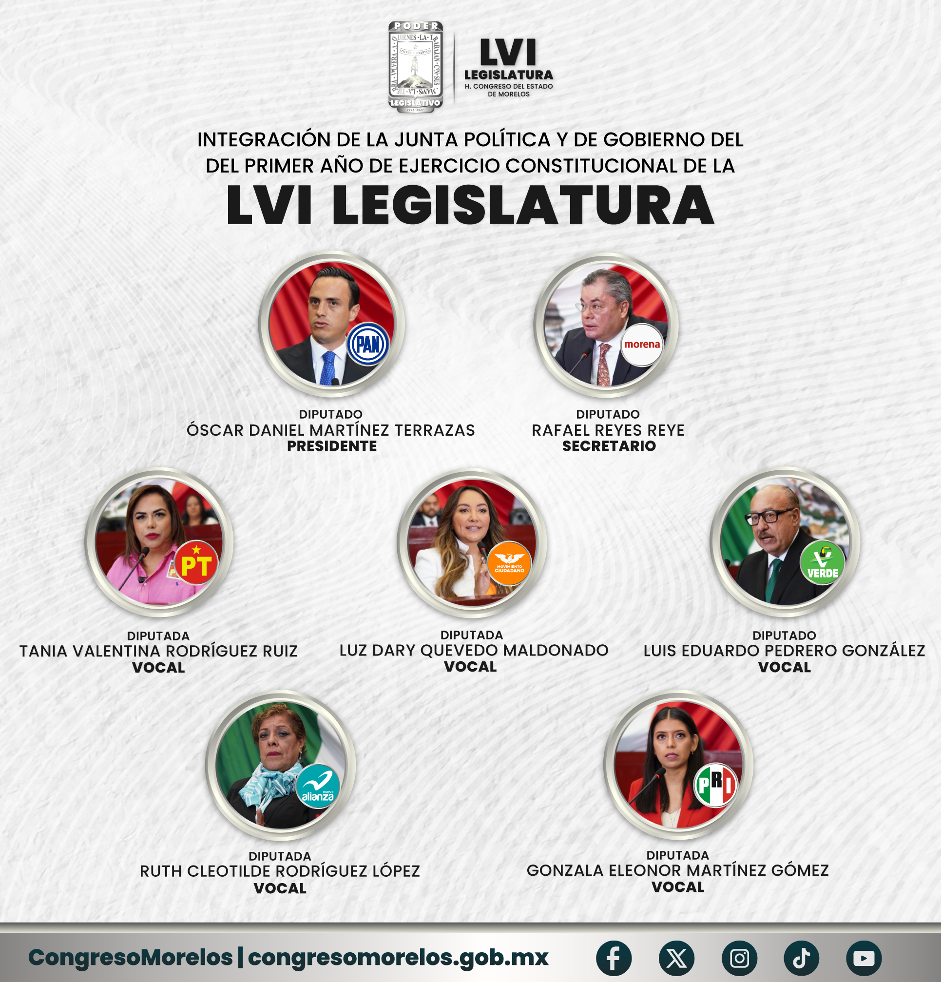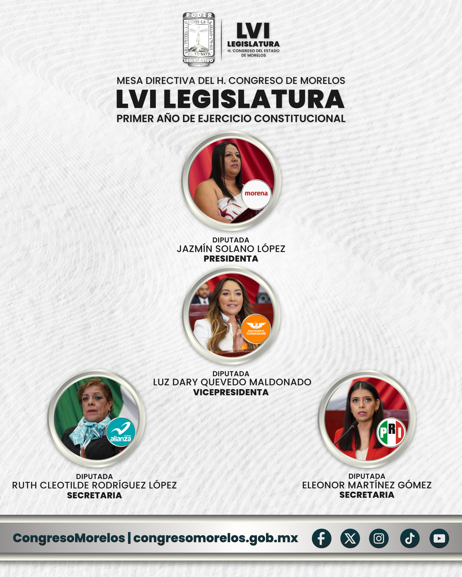 La Mesa Directiva del Congreso del Estado de Morelos, para el Primer Periodo Ordinario de Sesiones del Primer Año de Ejercicio Constitucional de la LVI Legislatura, está integrada exclusivamente por mujeres, por segunda vez en la historia del Congreso. Esta conformación refleja el avance de la paridad y el compromiso con una representación más equitativa en el poder legislativo.
