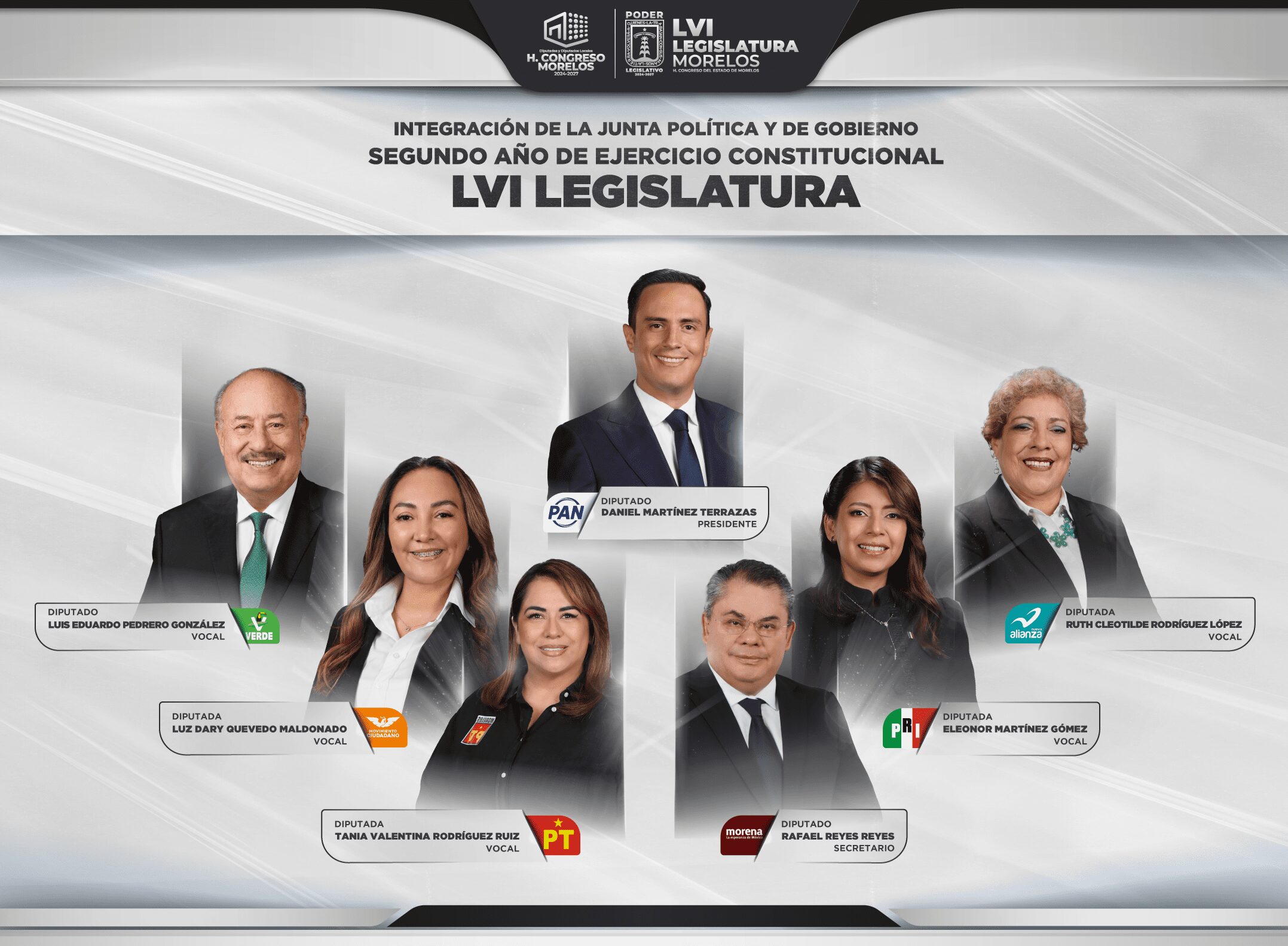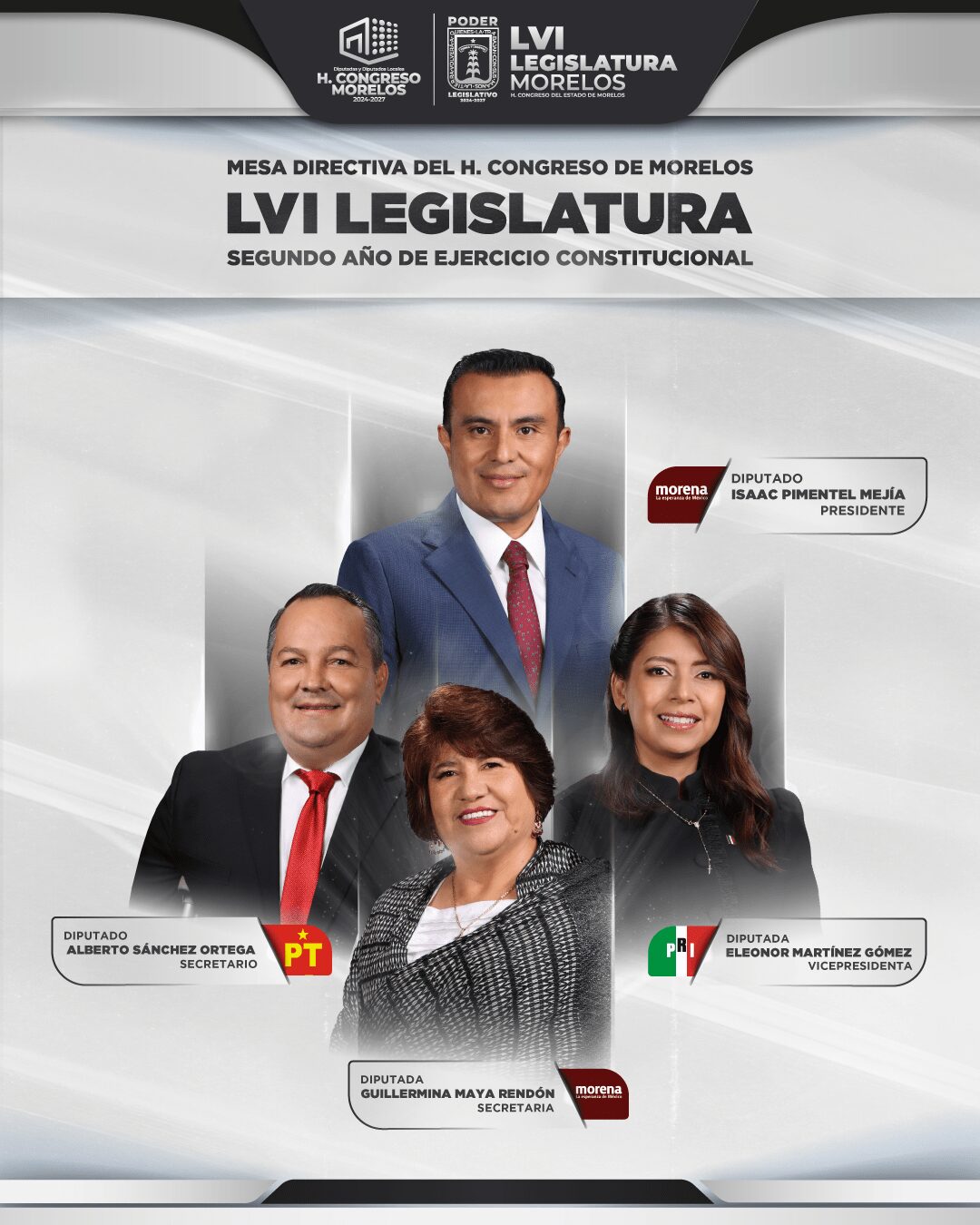 La Mesa Directiva del Congreso del Estado de Morelos, para el Segundo Periodo Ordinario de Sesiones del Segundo Año de Ejercicio Constitucional de la LVI Legislatura. Esta integración representa el compromiso de la LVI Legislatura con el trabajo plural, la representación democrática y el fortalecimiento institucional del Poder Legislativo en el Estado de Morelos.